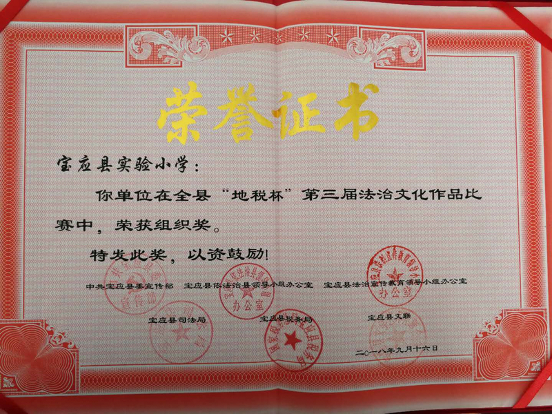 宝应县实验小学荣获全县“地税杯”第三届法治文化作品比赛组织奖。