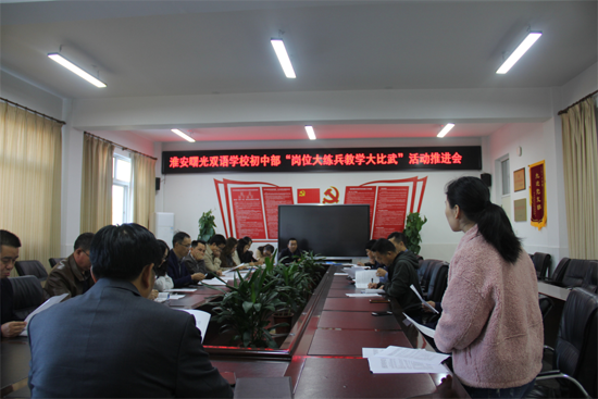 科研督导处副主任赵秀琳第一时间对本次“教学大比武”活动方案进行解读,她提出要以备课组为单位,确保人人都要上一节公开课。评委组要填写“淮安曙光双语‘岗位大练兵教学大比武’竞赛评价表”,并从备课、上课、课后反思及评课等方面给予综合评价,推荐3名优秀教师代表备课组参加教研组大比武。最终教研室胜出2-3名教师参加教学片组织的大比武活动。马主任对活动的考勤要求进行说明:各教研室以及各备课组长是此次活动的第一负责人,要持续组织同一备课组同一教研室的同仁全员参与听评课,要求每节课以小视频、图片、文字等方式进行考勤和精彩课堂的记录并及时发送学部相关群。