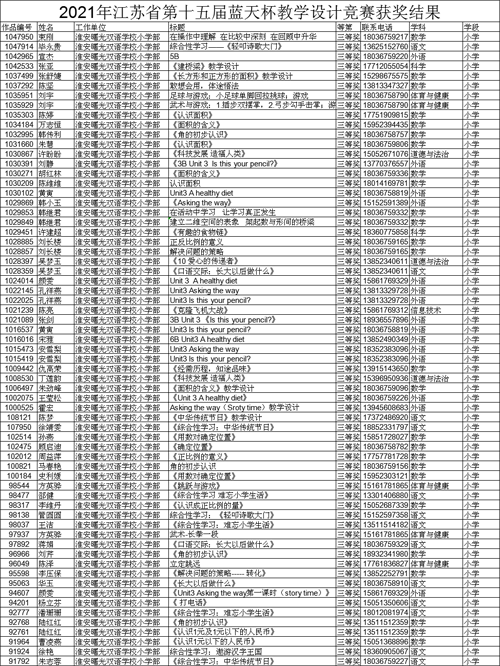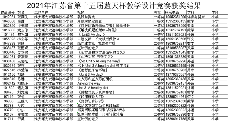 近期,江苏省第十五届“蓝天杯”教学设计评选结果揭晓。淮安曙光双语学校小学部89篇教学设计在竞赛中获奖。曙光小学部张沉侠、陈琳、史安菲、袁正信、鲍兆娟5位老师的教学设计喜获一等奖。杨立芬、张雨晴、姜正锦、管嘉琦、王莹松等19位老师获二等奖。史安菲、徐林、马春燕、刘婷、陈维维、陈凤云、毕永贵、宣杰、张亚、张舒婕、陈坚、刘宇等65位老师取得三等奖。