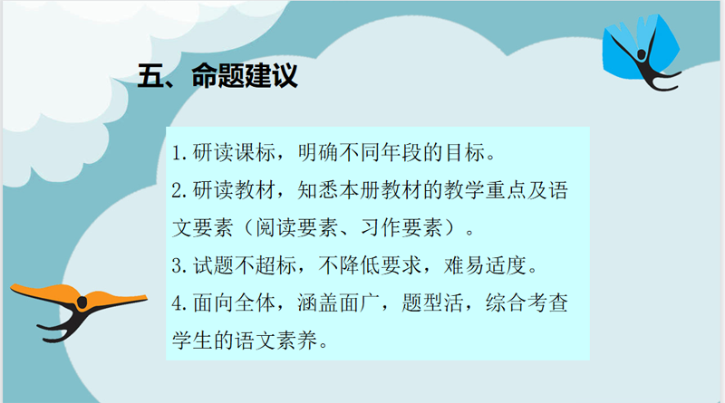 接着教学处主任吴梦玉结合“作业管理”中的相关要求,给全体语文老师做了题为《落实“双减”政策 共研命题策略》的语文命题专题培训。吴主任指出一份好试卷的标准是内容要均衡、题量要适当、题型要多样、难度要适中。她结合区教研室小学毕业水平测试卷对语文命题进行剖析,从"夯实基础,立足教材特点"、"阅读提升,指向语文要素"、"习作命题,落实年段目标"三个方面展开,并结合具体的题型及命题意图,有实例有理论。吴主任还对命题提出了建议:1.研读课标,明确不同年段的目标;2.研读教材,知悉本册教材的教学重点及语文要素(阅读要素、习作要素);3.试题不超标,不降低要求,难易适度;4.面向全体,涵盖面广,题型活,综合考查。让所有的语文老师受益匪浅,明白了今后命题的方向。