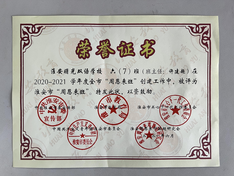 近期,从区教体局传来喜讯,淮安曙光双语学校小学部六(7)班(班主任:许建超)被授予2020—2021学年度“淮安市周恩来班”荣誉称号。