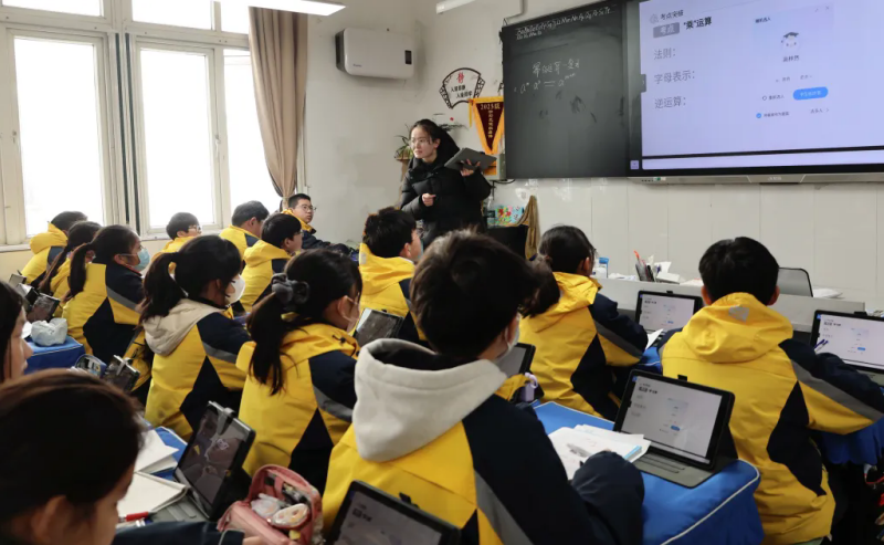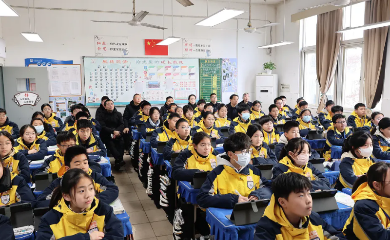 随后,参观团一行移步初一(6)班,观摩了董梦兰老师执教的数学智慧课堂。课堂上,董老师借助平板,将互动式、个性化教学融入课堂环节,展现了淮外在智慧课堂建设中的实践成果。