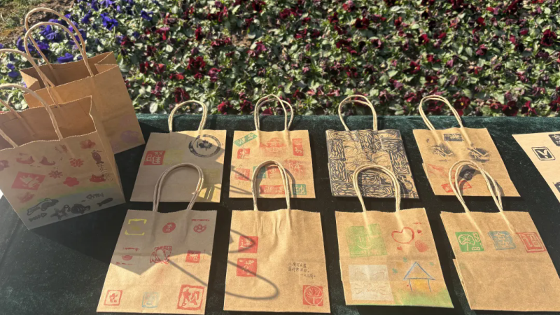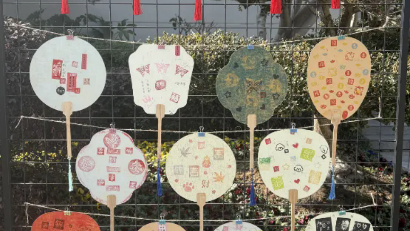 橡皮章展区作品形式多样,有不同形状的麻宣扇子、鎏金扇子,还有书签、牛皮纸袋和日历卡纸。上面印着同学们精心刻制的橡皮章图案,走近一瞧,有“福”、“吉”、“如意”等吉祥字样,还有“马”、“蝴蝶”、“葫芦”、“鱼”、“元宝”等有寓意的图形。每件作品的构图、色彩搭配各具巧思,体现了淮外学子的无限创意。微风拂过,流苏轻晃,年味悄悄在校园中弥漫……