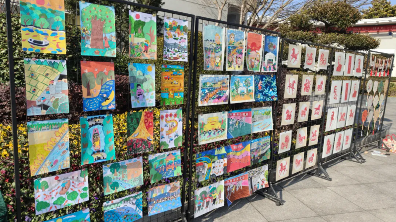 走进农民画展区则是一场色彩的狂欢。大块的明黄、翠绿、赤红铺陈在画布上,同学们以淮安的里运河风光、校园运动会的呐喊场景为灵感,把日常的小美好画成了鲜活的画卷。浓烈的色彩与童真的构图,让民间艺术的生命力在校园里肆意生长。