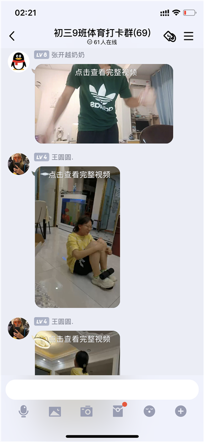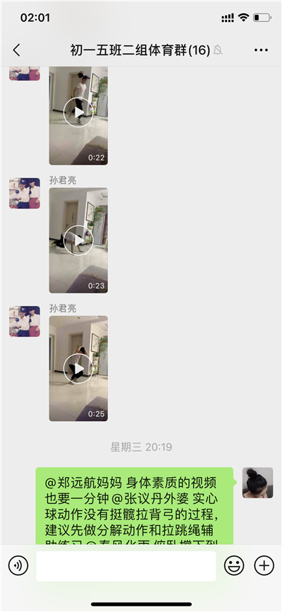 此项工作由体育教研室全体成员和班主任老师负责,分阶段制定科研有效的体育训练计划,充分利用每天半小时进行体育锻炼,由家长记录并发送到班级专门的体育打卡群中,体育老师顺利获得视频对学生的动作进行指导,确保训练效果最大化。引导和督促学生持续参加体育锻炼,增强身体素质,养成终身体育锻炼的好习惯。
