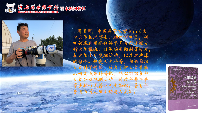 周团辉博士将本次科普讲座的题目定为“‘暴躁’的太阳公公与‘神秘’的月亮婆婆”。周博士在讲座中提到,太阳,堪称太阳系绝对的王者,在平常生活中最熟悉也最神秘。太阳为人类的生活给予了各种便利,比如风力发电、植物光合作用、太阳能电子板,都直接或间接地造福人类生活。平时,肉眼所见的太阳是带有颜色的,而顺利获得天文望远镜观测到的天体却大有不同。太阳系的形成和演化始于47亿年前。