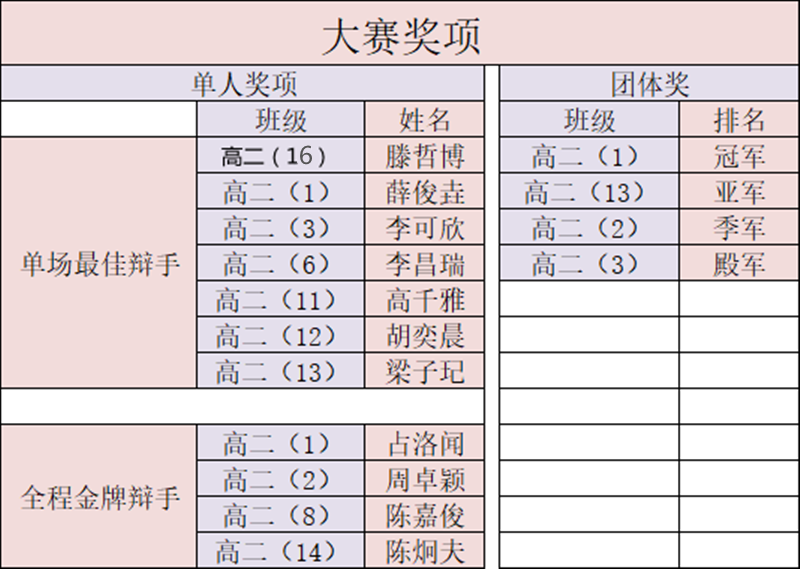 从初赛到复赛,再到总决赛,历经14场,场场考验着学生的思辨能力。总决赛第一场:13班(正方)VS 3班(反方),正反辩题为:“我愿意或不愿意生活在一个只有真话没有谎言的世界里。”13班胜出;第二场:2班(正方)VS 1班(反方),正反辩题为:“苏格拉底应该或不应该越狱。”1班胜出。在辩论中成长,在辩论中学会站在对方的角度思考问题。
