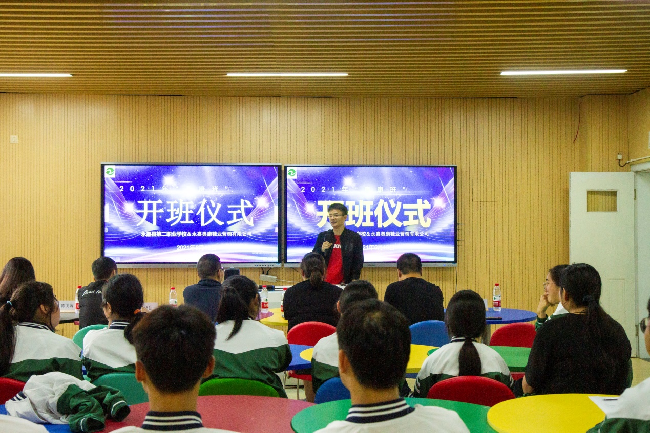 为了深入贯彻学校“校企合作、深度融合”的指导方针,进一步提升应用型人才培养质量,强化学生社会实践能力的培养,永嘉县第二职业学校与永嘉奥康鞋业营销有限公司合作开设了订单班。5月19日下午在我校创空间举行了订单班开班仪式,永嘉二职夏林苏副校长、实训处戴建法副处长、永嘉奥康鞋业营销有限公司人事行政部经理卢卫敏、区域财务负责人徐林巧、业务财务经理谢小宁、课程讲师陈美茜及订单班50余人参加了活动。本次活动由永嘉二职实训处李群处长主持。