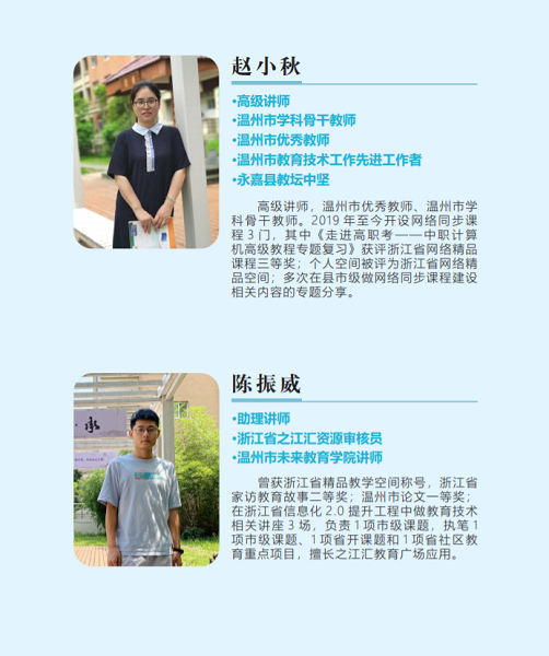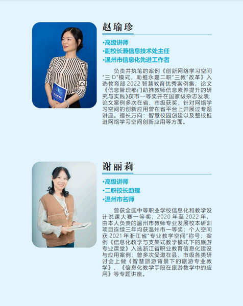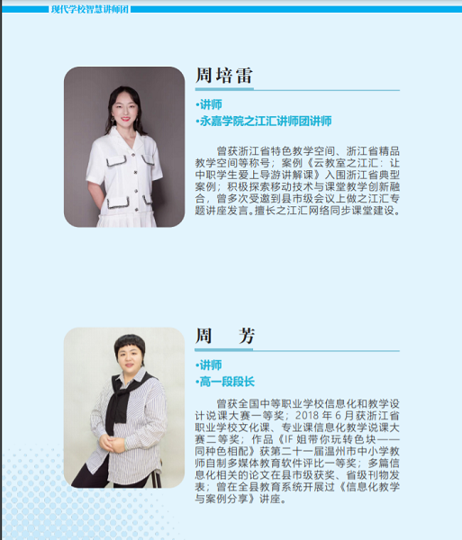 “未被疑云遮望眼”,风物长宜放眼量。永嘉二职的智慧教育推广工作先行一步,已然超前了其他兄弟学校。学校智慧教育讲师团于2021年6月份创建,多次承接省(市、县)级之江汇平台应用、智慧教学和智慧校园钉钉平台培训,专题讲座超过50场次,很好地带动了全县乃至全市周边学校智慧教育的同步开展。