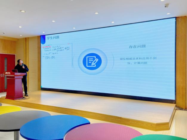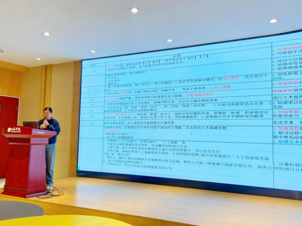 紧接着,高三语数备课组组长周培培和李阿念老师代表发言,从考试成绩、试卷难易、学生做题情况以及今后的应对策略四方面对省三联的语数成绩进行分析。高三语文备课组依据得分率发现高三学生在诗歌赏析、文言实词推断、文言文句式、标点和翻译等方面十分欠缺,高三数学备课组则依据学生的答题情况做针对性分析,发现学生存在错位相减法求和应用不到位、分段函数没有求解过程、对称轴只找一个周期内等问题,分别提出了针对性策略,为接下来语数复习工作确定了基调。
