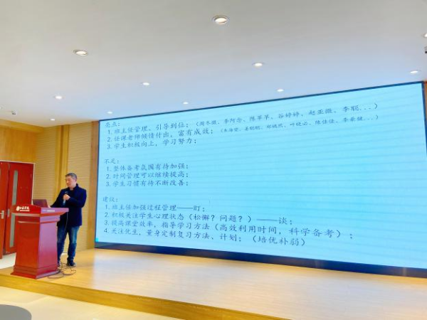 姜涛老师从横向和纵向两个维度对各专业的省三联成绩进行了认真细致的比较分析。顺利获得详实而精确的语数成绩展示,让与会教师分析各专业情况,同时掌握头部学生的优势科目与薄弱学科。同时强调教师要分析考卷小分表内容,第一时间发现学生仍较为欠缺的知识点,由此可以在接下来的教学过程中有重点、有方向、有节奏地查漏补缺。最后姜涛老师指出现阶段高三工作的亮点、不足和建议,为接下来的教学工作和班级管理工作指明方向。
