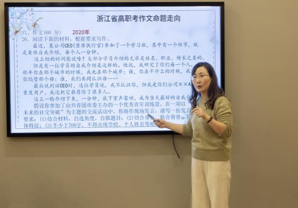 然后罗老师给大家带来了《开始写吧!——高职考写作研讨》专题讲座。罗老师从“审读辨题型”“立意见思辨”“说法有章法”“题好文一半”四个方面对高职考作文进行了分析解读。罗老师的讲座内容直指教学痛点难点,提出的方法可操作性强,让老师们获益良多。