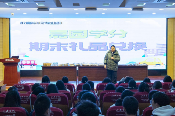 “2023年已然过去,转眼间,永嘉学院又陪伴大家度过了一个学期。亲爱的同学们,期盼已久的嘉园学分兑换活动正式开始啦,我们诚意满满地准备了精美的礼品,让大家在幸福的积分兑换中迎来全新的2024年!”周芳的一席话让底下的学生激动不已。