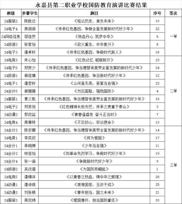 为了进一步丰富军训生活,增强学生的爱国情感,永嘉县第二职业学校于9月8日召开了以“传承红色基因,争当德智体美劳全面开展的新时代好少年”为主题的高一国防教育主题演讲比赛。此次活动不仅为新生军训生活增添了浓厚的文化氛围,更激发了同学们的爱国热情。本次活动邀请了学生处副处长金新建出席,由教务处副处长韩飞,陈苹苹、李盛涨老师担任评委,谢博文同学主持。